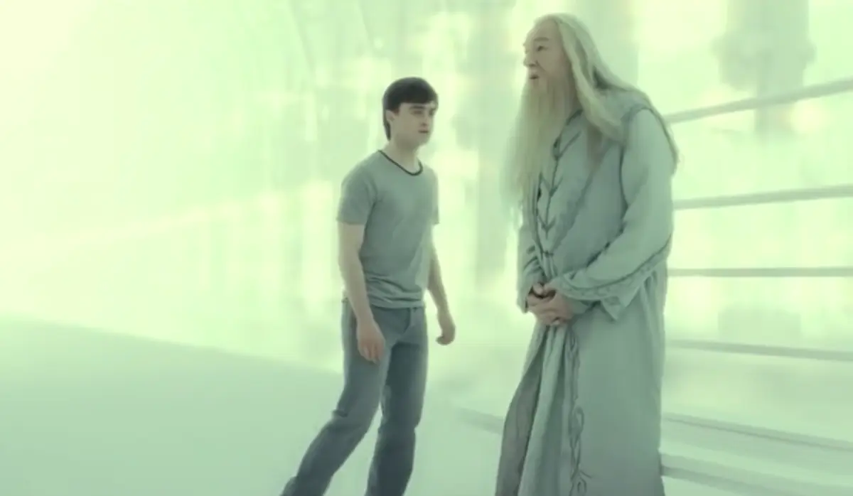 After Voldemort casts the Killing Curse, Harry wakes up in limbo and he's greeted by Dumbledore on a bright, white train platform.