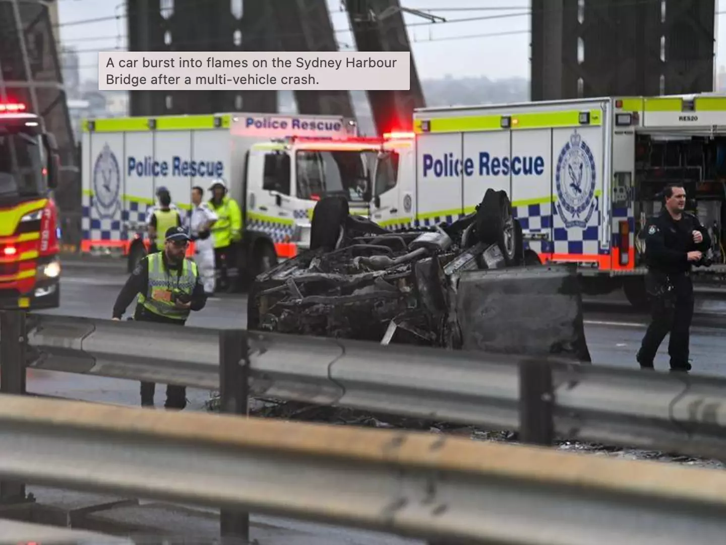 A car has flipped and burst into flames after a three-vehicle collision on the Sydney Harbour Bridge.