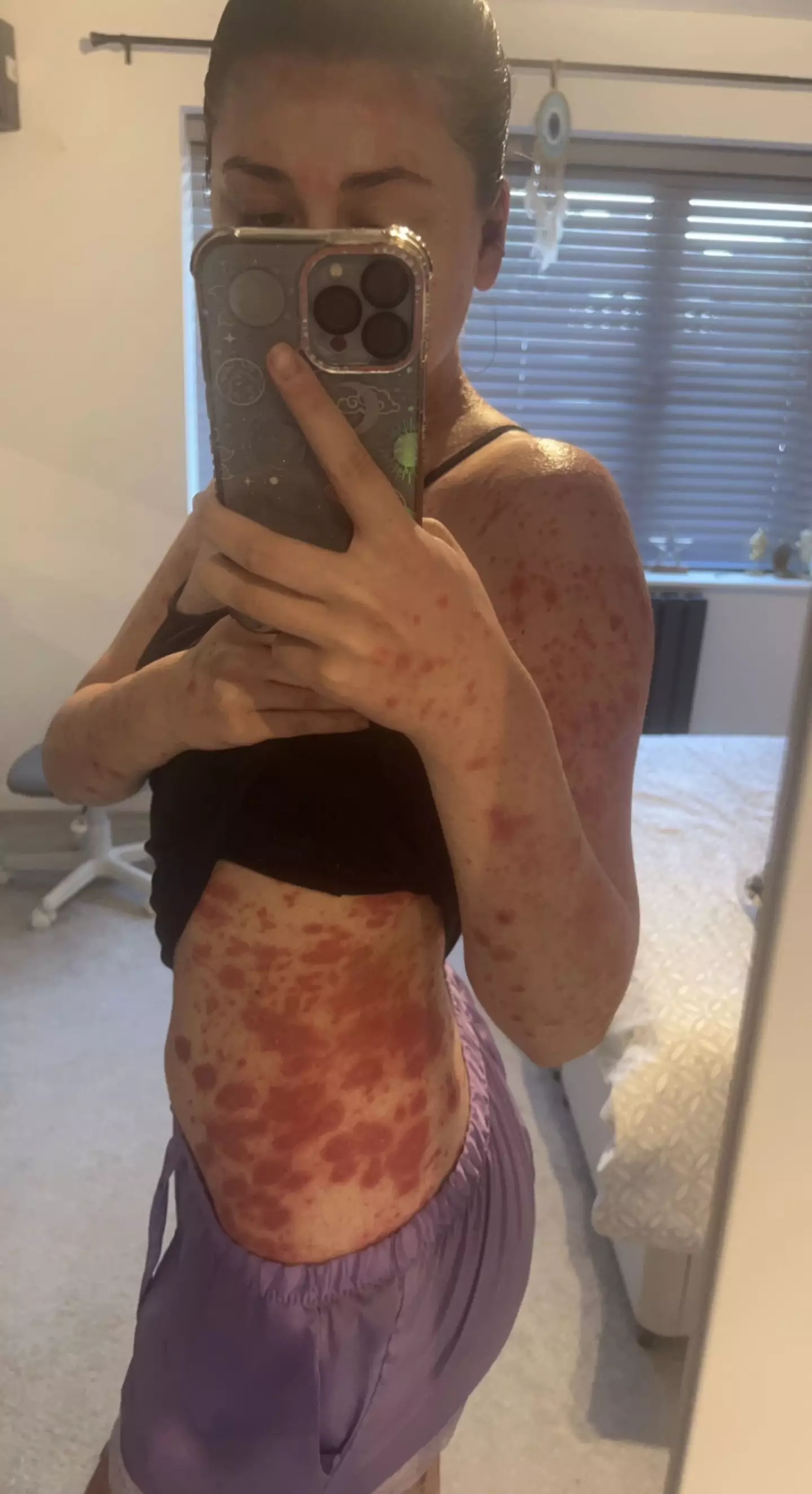 Emily Angel Pellegrini, from Poole, Dorset, first noticed a tiny scab on her chest at the start of the year, but she assumed it was just caused by friction from her bra - until it got bigger and spread across her body.