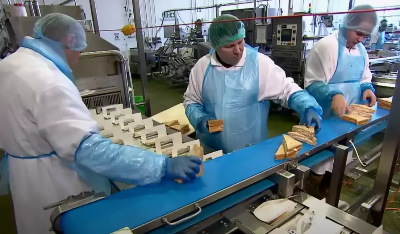 The documentary shows worker's hands adding grated cheese and cold cuts of ham to each sandwich and putting them together before a machine then slices them neatly into triangles to be packaged.