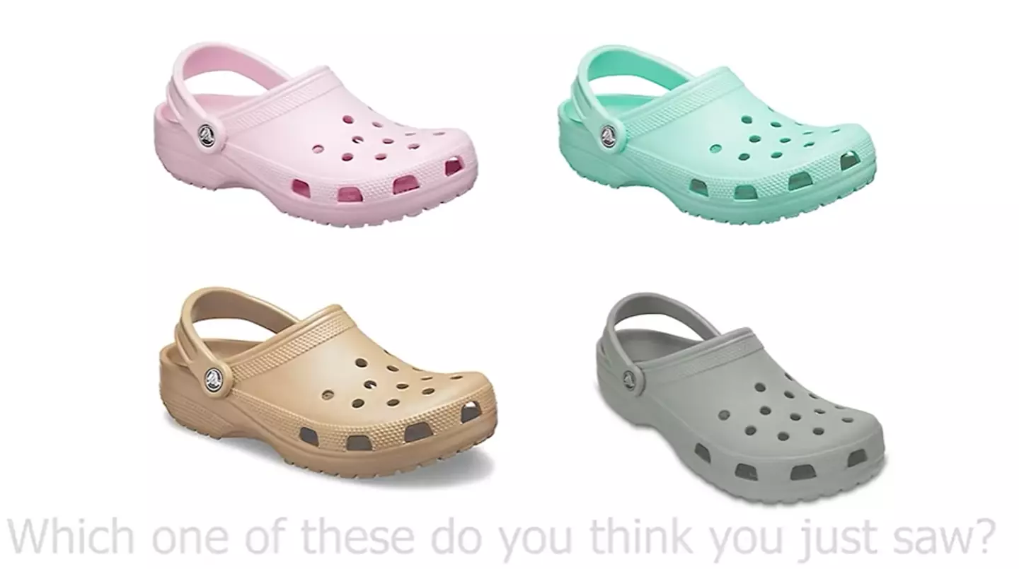 Then, viewers are asked to discern what colour the Crocs are out of four images – pink, green, gold or grey.