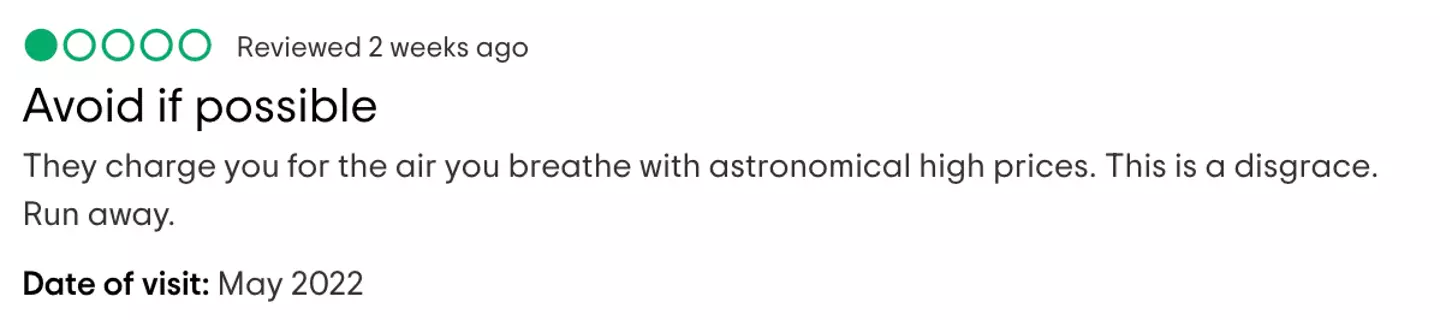 One review states: "You are lured in with happy waiters welcoming you in and sat down with no menus and when you can see a menu there’s no prices. We ordered one cocktail apiece and 12 oysters and it was over £400. This place is a scam and needs to be investigated."