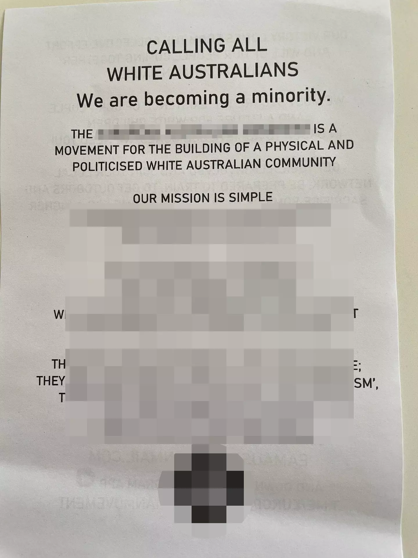 The leaflets revealed the group's mission is to promote the 'preservation' and 'advancement' of white people in Australia.