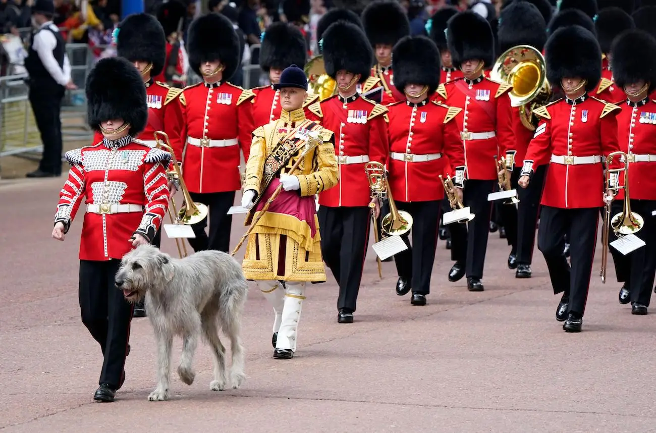 Now that the Queen's Platinum Jubilee is in full swing, the Irish Guards arrived at the march at Horse Guards Parade in front of the large crowds, led an Irish Wolfhound called Seamus.