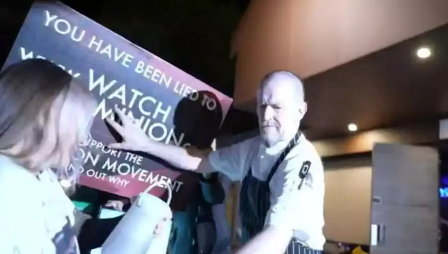 The mountain was even captured grabbing the megaphone from one protester as the woman fought for control before security guards had to intervene.