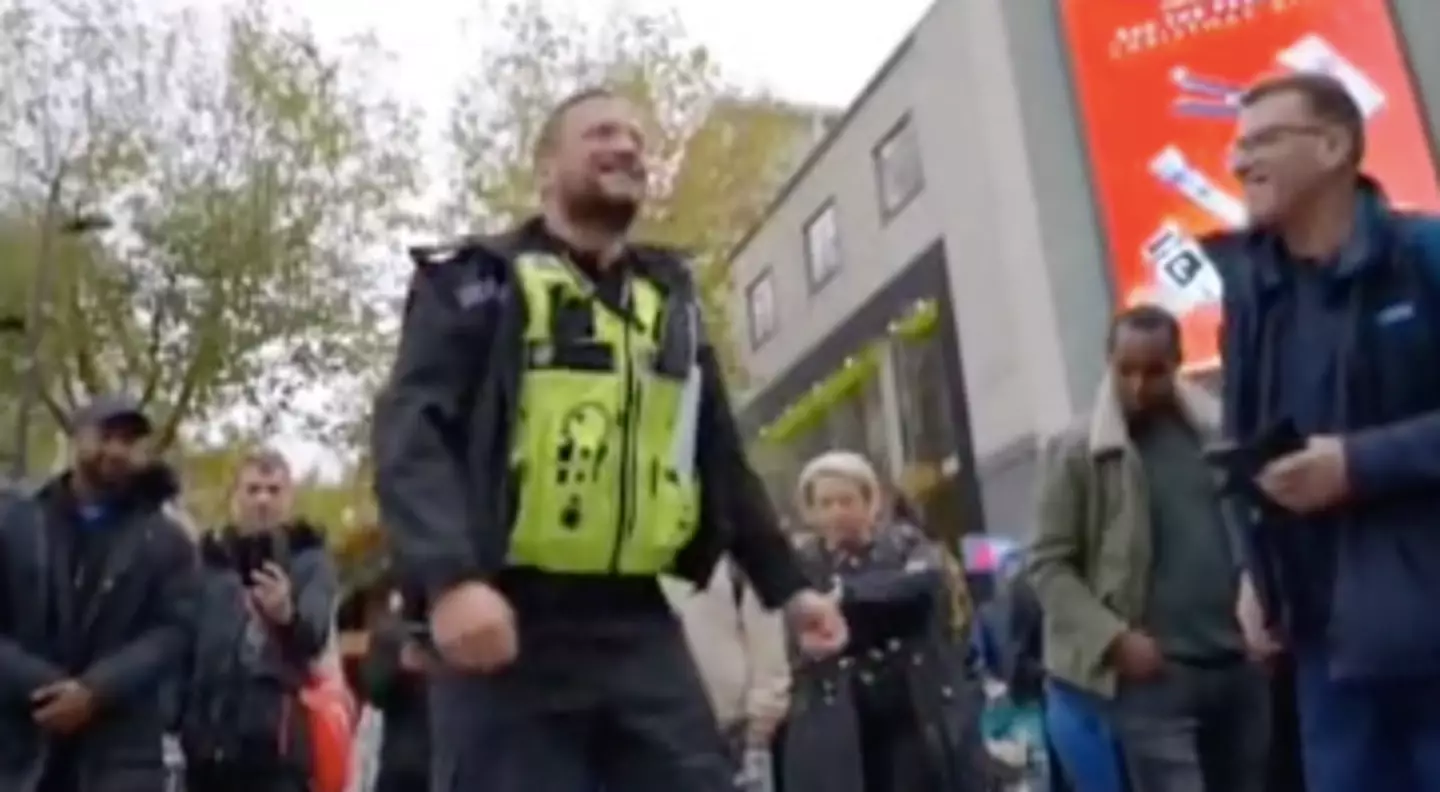 A diverse range of men attempt the lift - one in a brown trilby and cords, one in a full-black tracksuit, and even an on-the-job police officer.