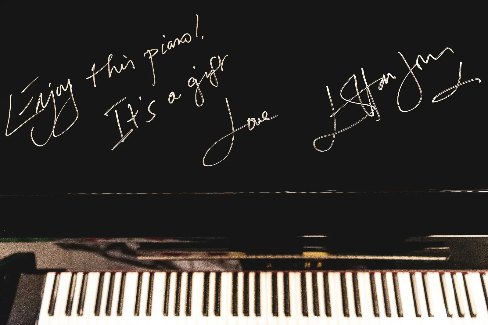 His message reads: “Enjoy this piano. It’s a gift. Love, Elton John.”