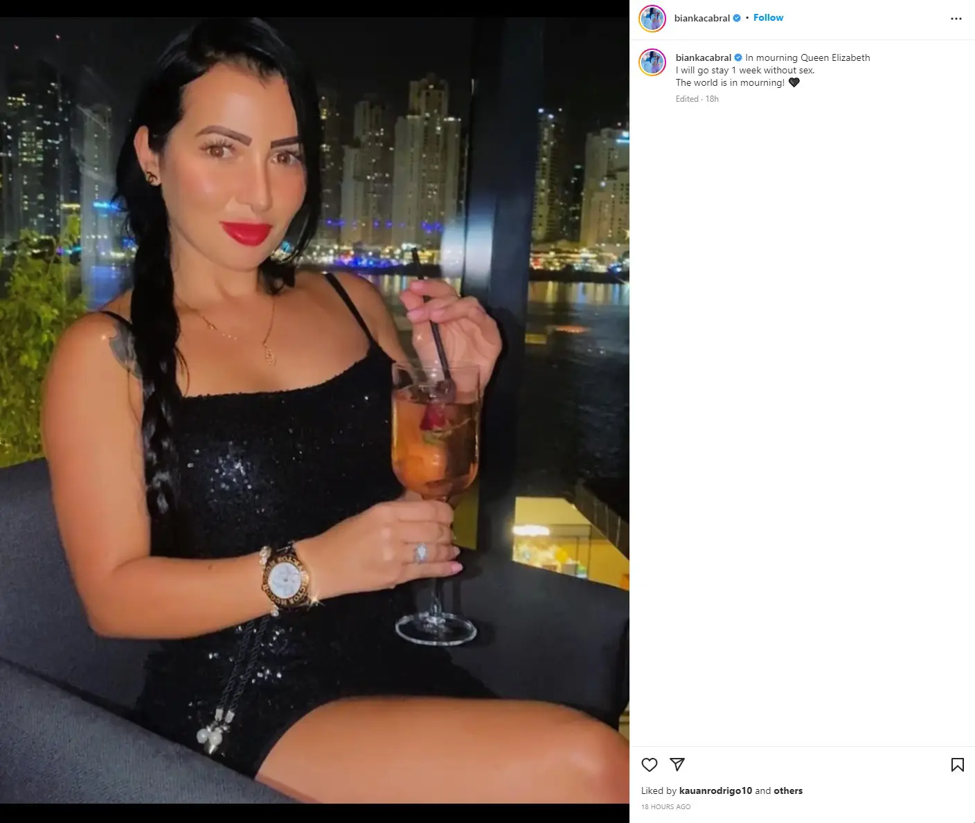 A third model, Bianka Cabral, representing Oxford, agreed to participate in the bizarre tribute too, sharing with her 594,000 followers on Instagram (@biankacabral): “In mourning Queen Elizabeth I will go stay 1 week without sex. The world is in mourning!”