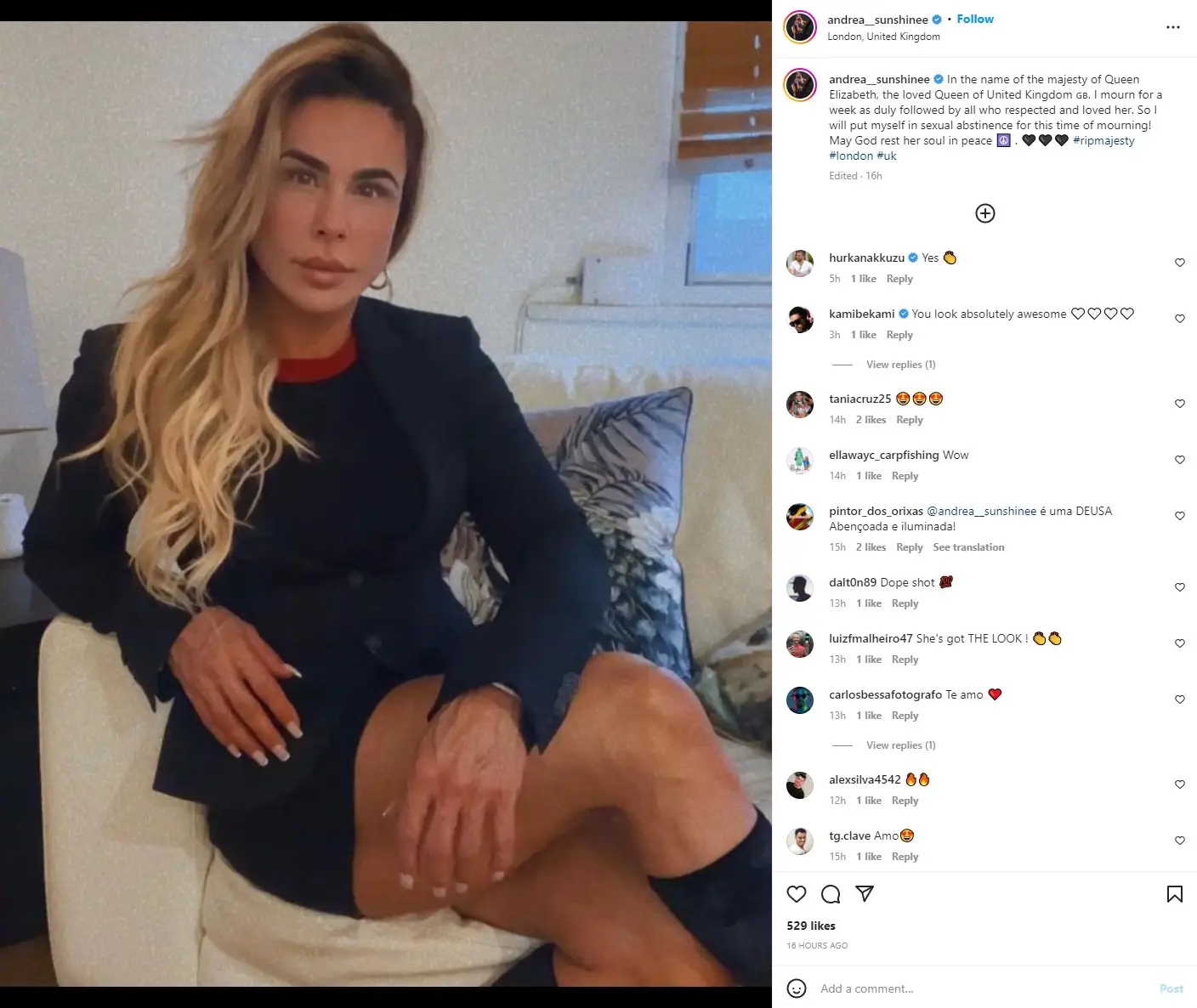 Fellow model Mikaelly, representing Manchester, echoed the sentiment in a similar post, commenting: “In mourning Queen Elizabeth I will go stay 1 week without sex. The world is in mourning!”