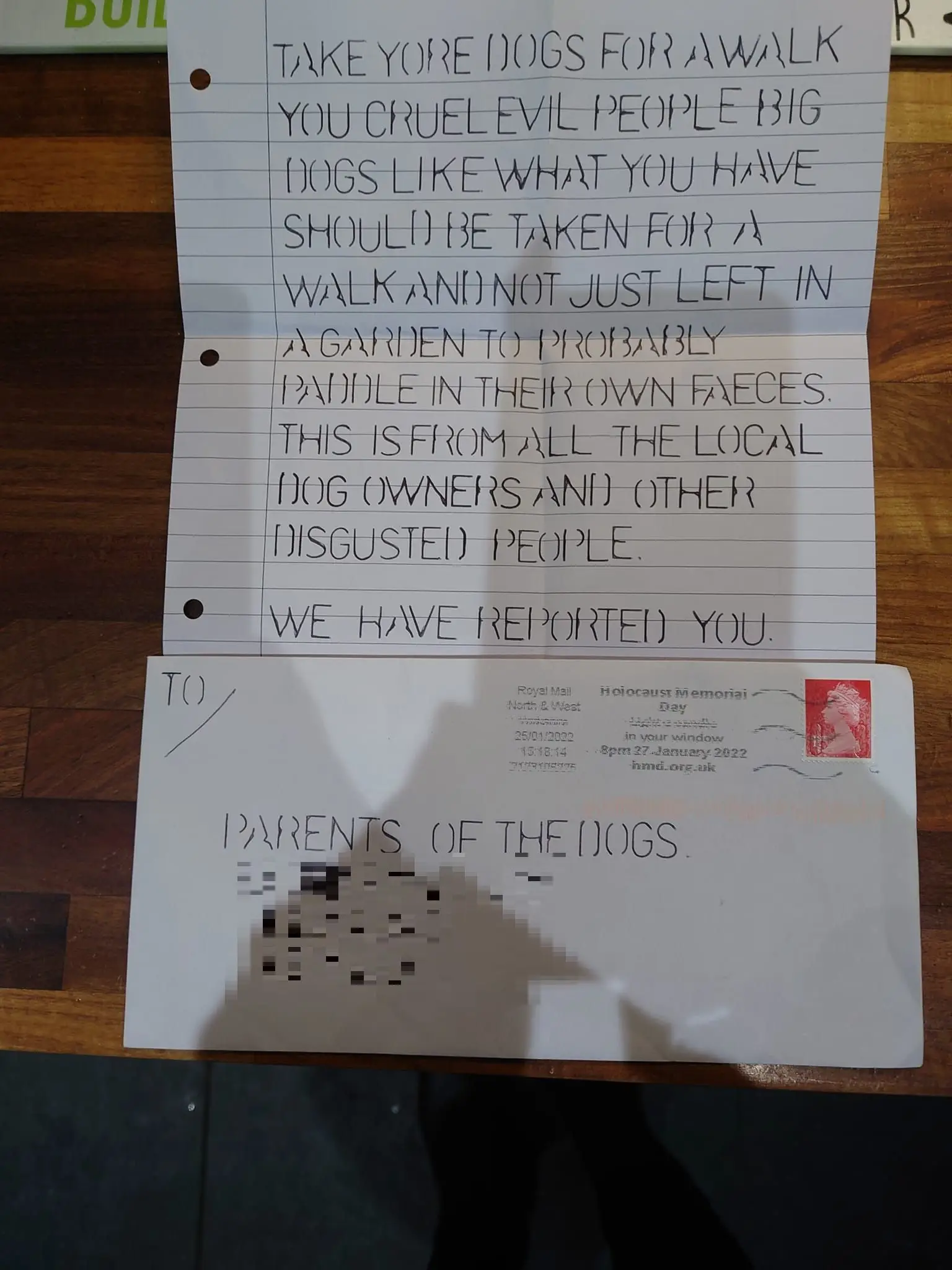 The letter reads: "Take yore (sic) dogs for a walk you cruel evil people.