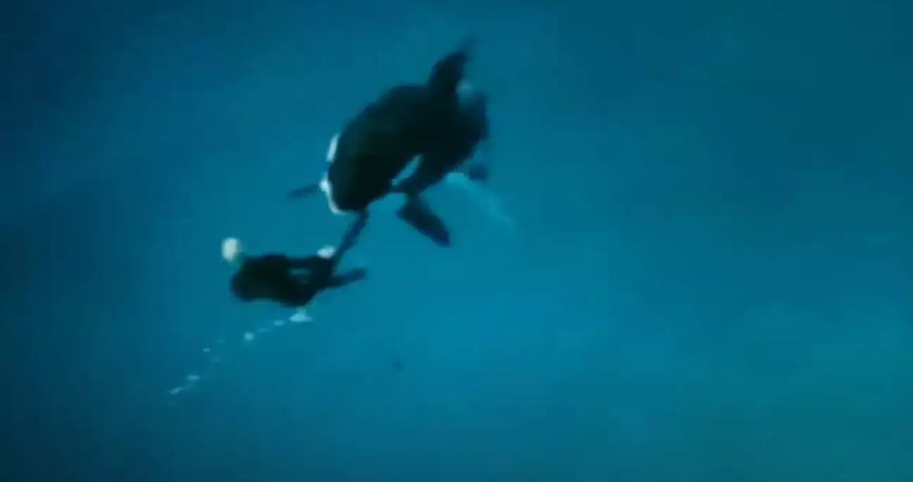 Every now and again, the orca would swim back up to the surface while Peters would desperately try to gulp in air before being dragged back down again.