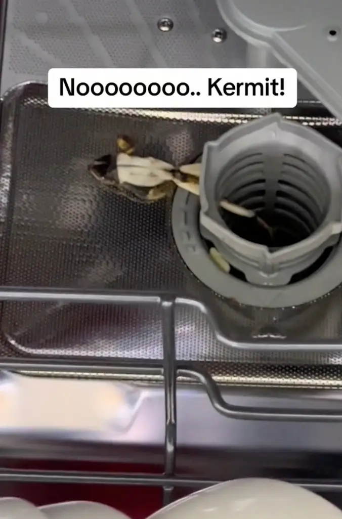 She shared a video to TikTok showing the poor frog lying spreadeagled on the bottom of the dishwasher, with it's legs appearing to be stuck in between the vents of the filter.