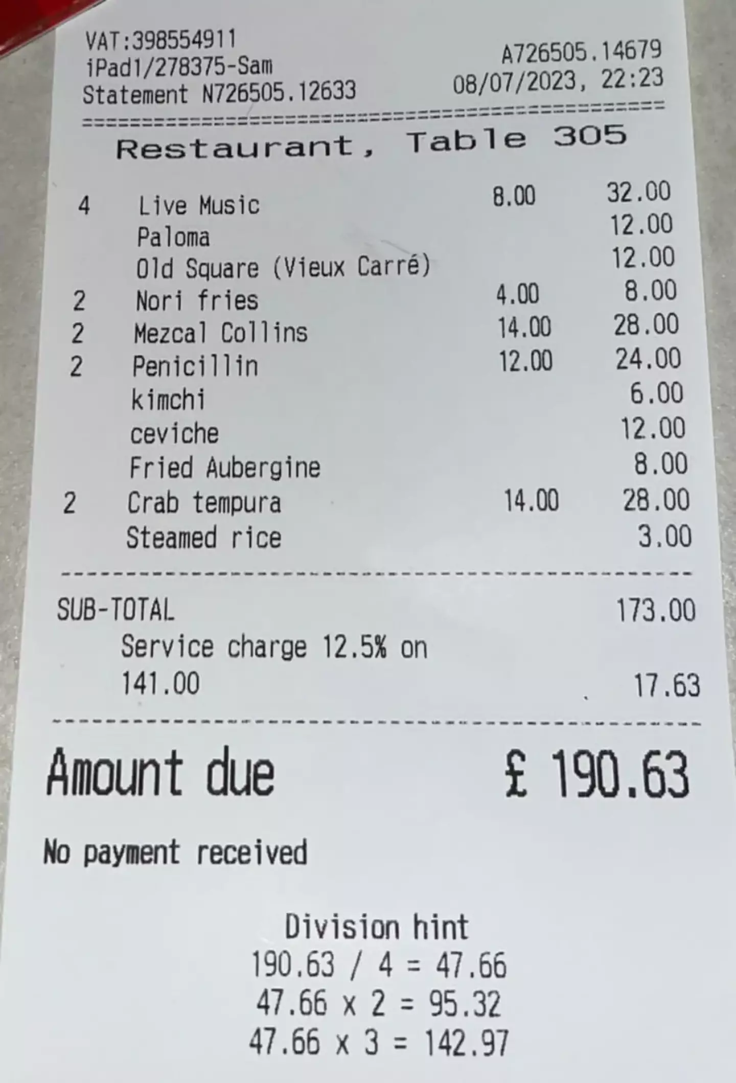 AsperLDN97 posted a receipt on Reddit showing that his girlfriend and her three friends were each charged $8 for live music.
