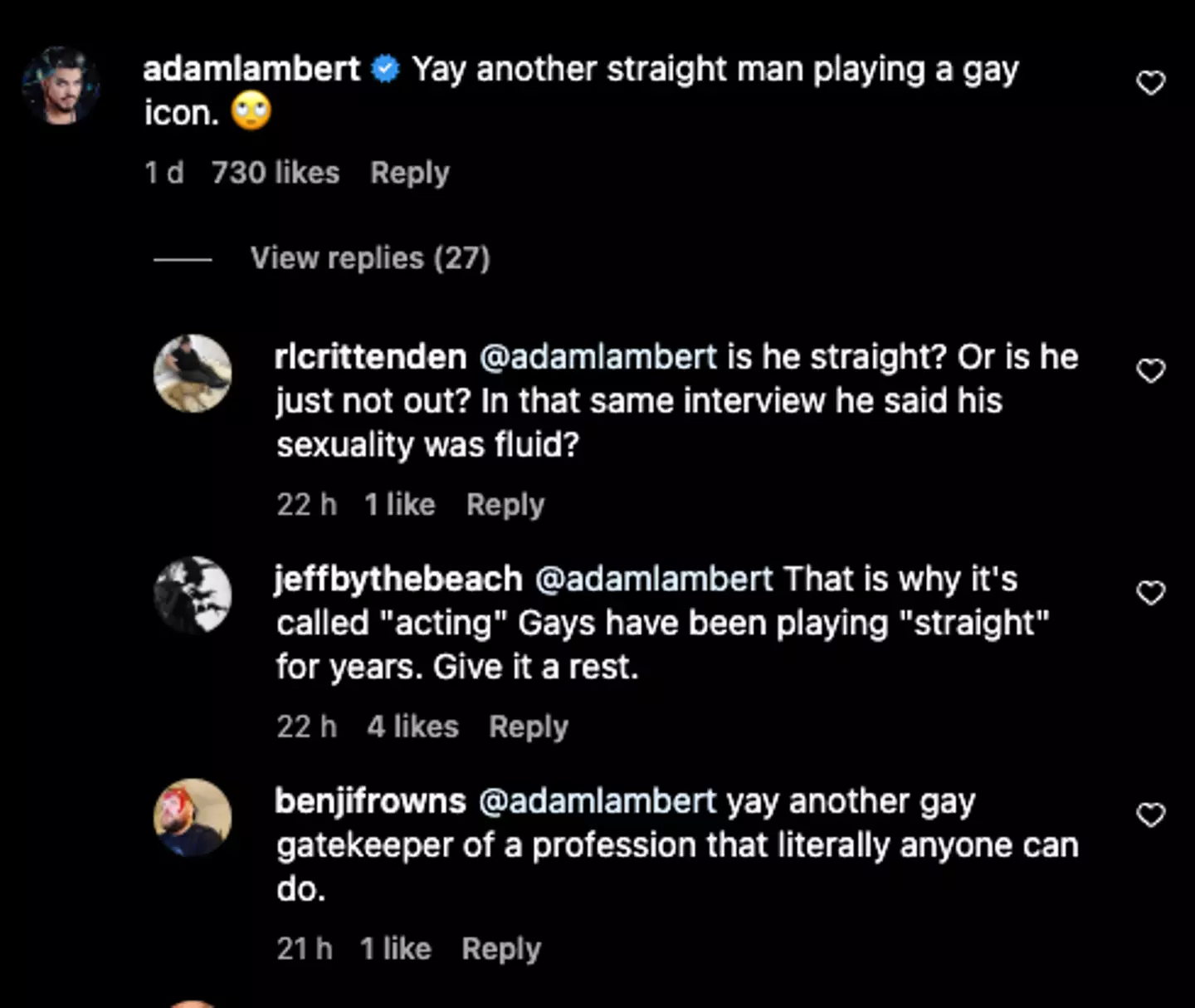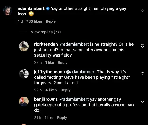 Alongside an eyeroll emoji, Lambert wrote: "Yay another straight man playing a gay icon."