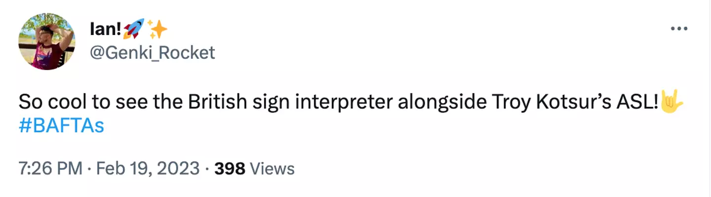 "The BAFTAs have an ASL to BSL translator. This is proper sick!" another viewer wrote.