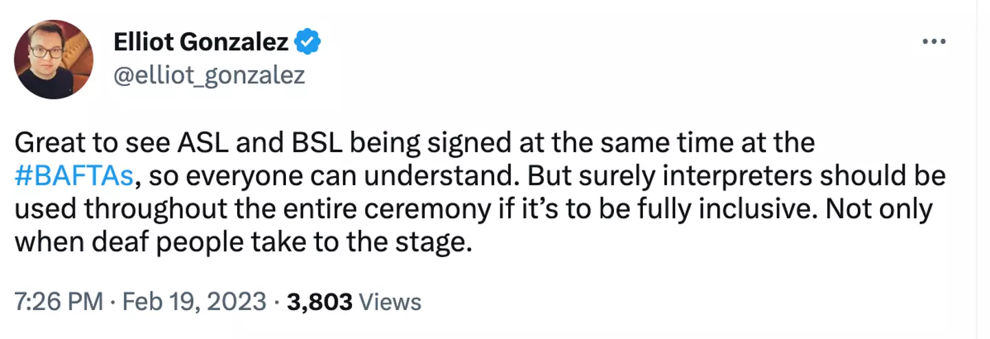 “I hate that BAFTA will have a sign language interpreter while the deaf presenter is on stage but won’t have an interpreter when every other presenter is on stage,” they wrote.