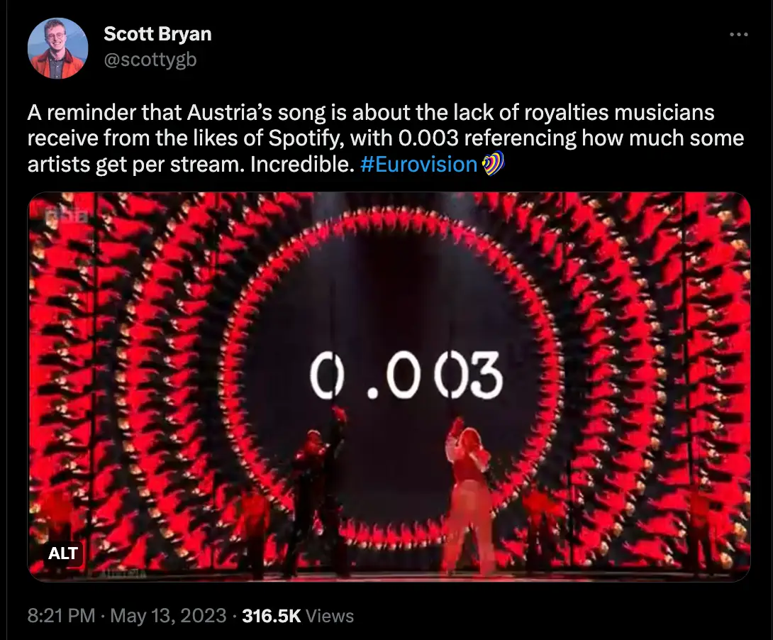 Taking to Twitter, TV and film critic Scott Bryan wrote: “Austria’s song is about the lack of royalties musicians receive from the likes of Spotify, with 0.003 referencing how much some artists get per stream.