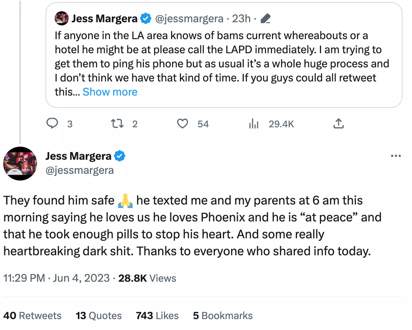 He'd written: "If anyone in the LA area knows of bams current whereabouts or a hotel he might be at please call the LAPD immediately.