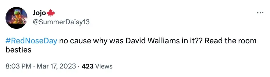 Taking to Twitter, one said: "#RedNoseDay no cause why was David Walliams in it?? Read the room besties."