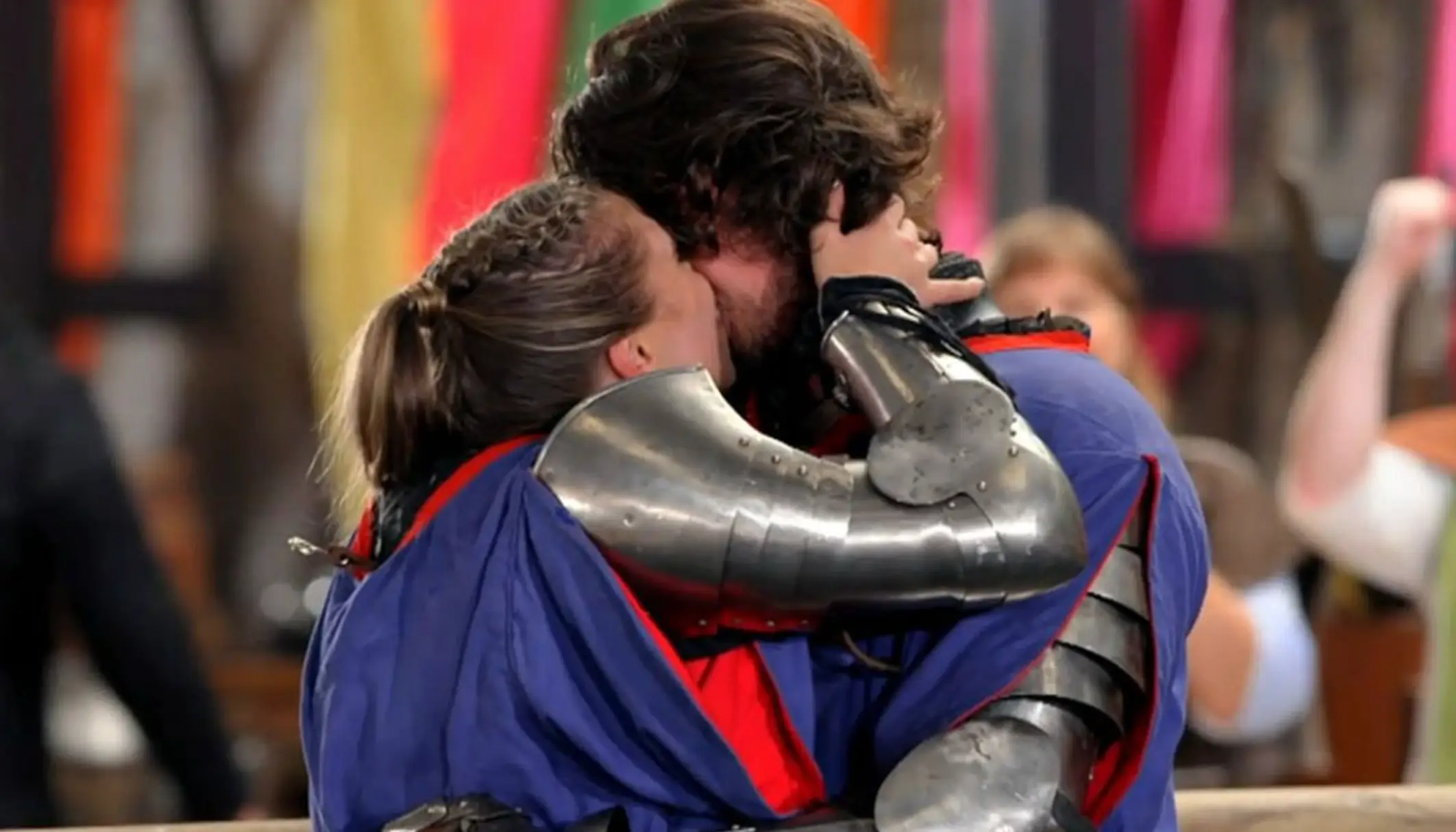 Another couple share a passionate kiss in medieval attire (because what else would they be wearing?)