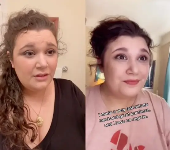 Her text overlay on the vid reads: "I made a very last minute meet and greet purchase, and I have no regrets."