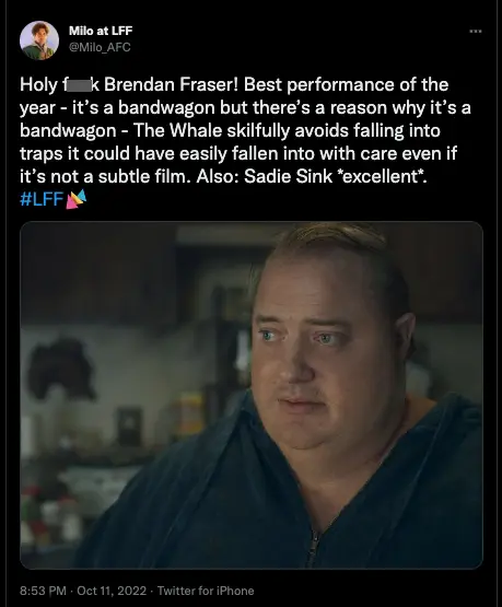 A third continued the film's praise-fest: "The Whale is a force of nature, [Darren] Aronofsky at his most intimate and intricate, following the slow self destruction and self-imposed exile of a damaged soul, but still bearing that soul in all its empathetic beauty. Fraser is stunningly vulnerable, Hong Chau is shattering."