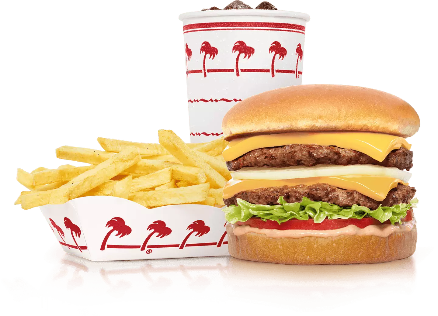 The answer is American fast food chain In-N-Out, particularly their double-double burger, made animal-style.