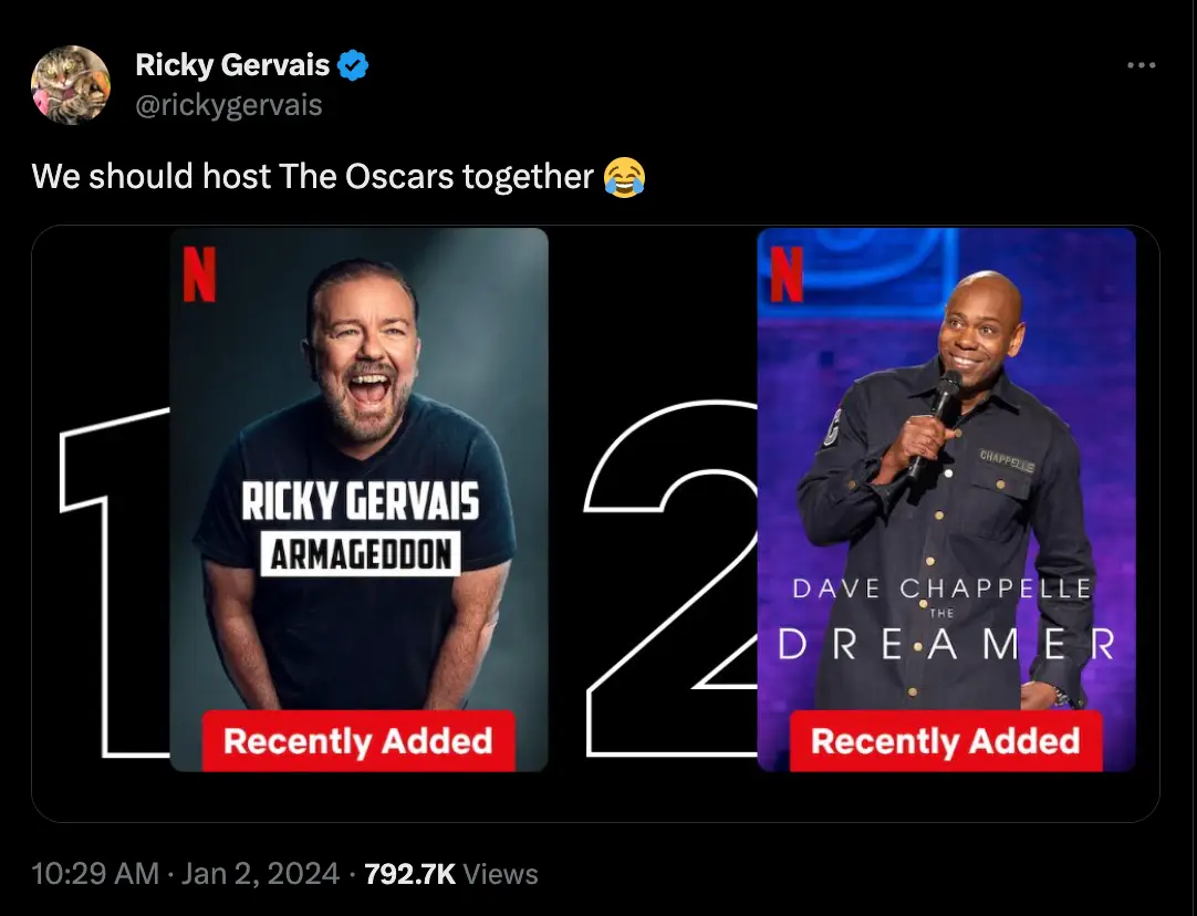 Topics: Ricky Gervais, Celebrity, Oscars, TV and Film, Netflix