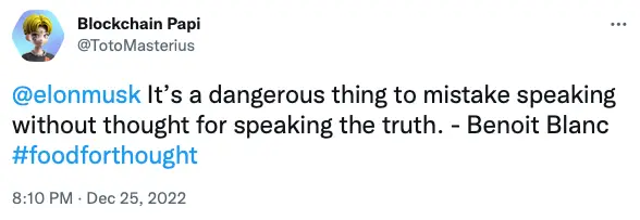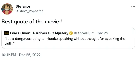 One fan then respond with the Glass Onion quote - from Craig's detective directed at Kate Hudson's character in the movie - which reads: "It’s a dangerous thing to mistake speaking without thought for speaking the truth."
