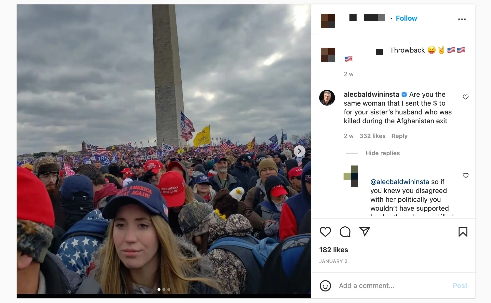 But after Roice posted a 'throwback' picture from the protest in Washington on 2 January 2022, Baldwin commented asking: "Are you the same woman that I sent the $ to for your sister’s husband who was killed during the Afghanistan exit?"