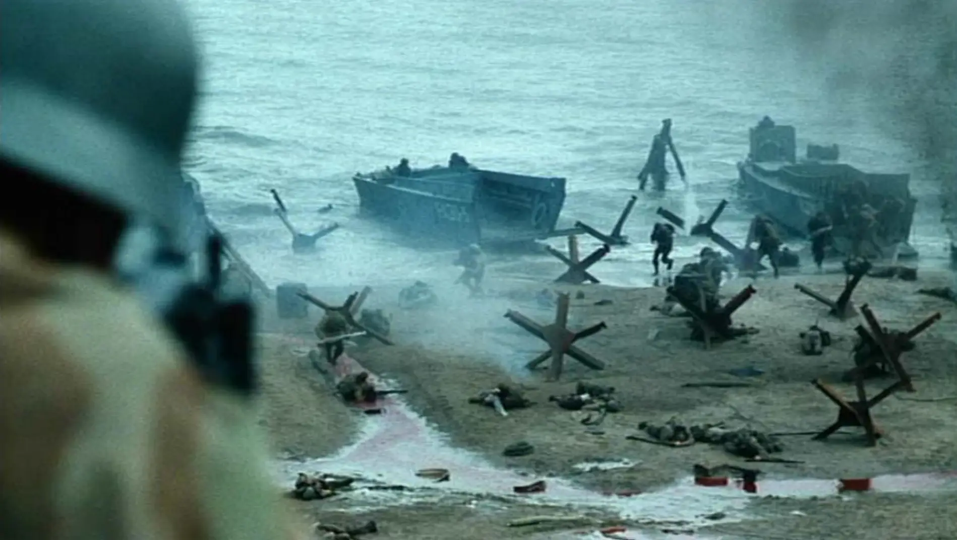 The boats arrive on the shore and soldiers are picked off one by one in a horrific fashion from the German forces.