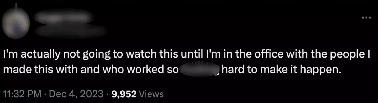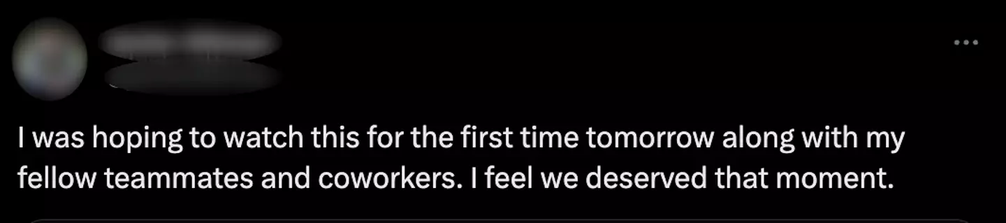 "I was hoping to watch this for the first time tomorrow along with my fellow teammates and coworkers. I feel we deserved that moment," one wrote on X.