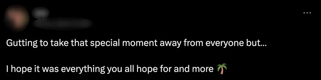 "Gutting to take that special moment away from everyone but...I hope it was everything you all hope for and more," a second added.