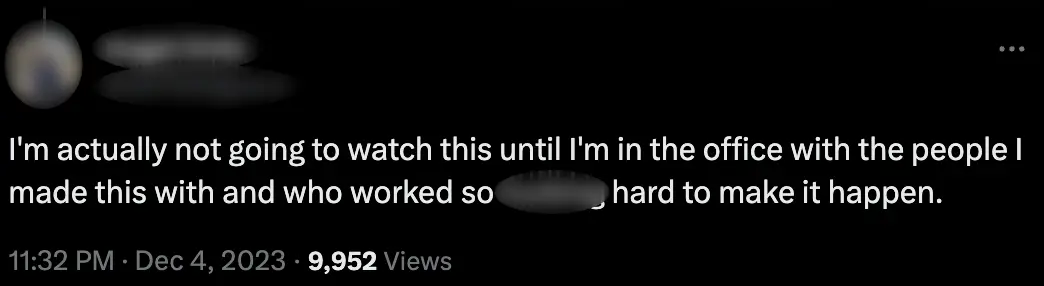 "I'm actually not going to watch this until I'm in the office with the people I made this with and who worked so f**king hard to make it happen," a third commented.