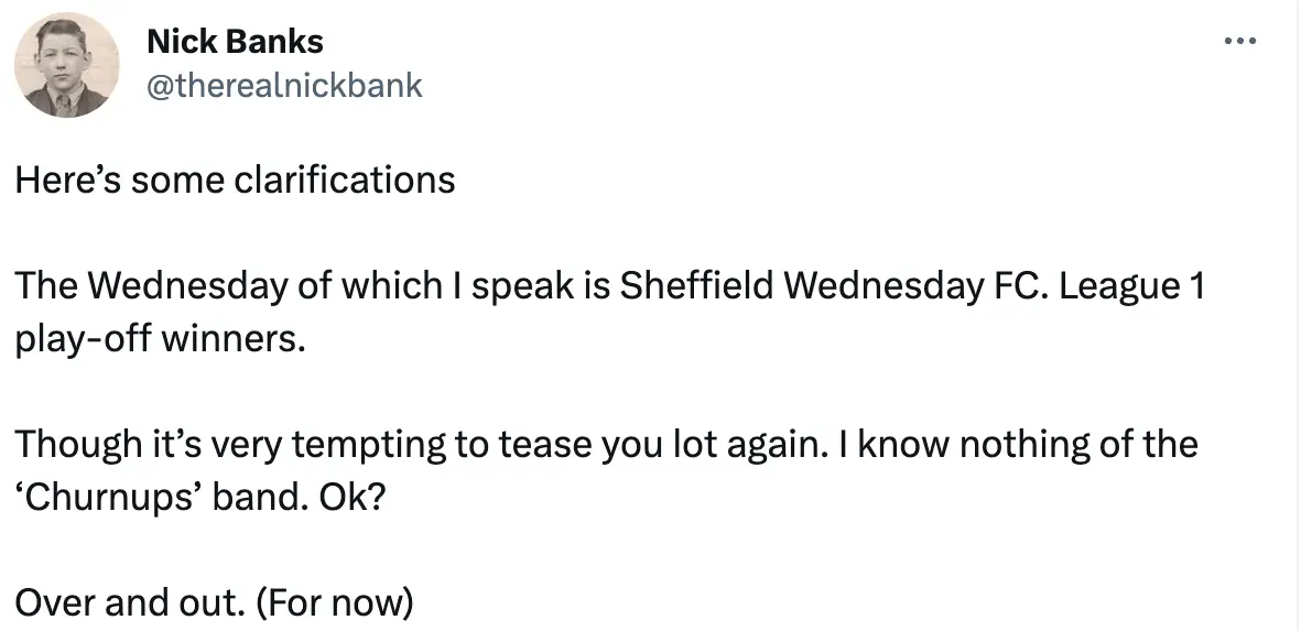 "Though it's very tempting to tease you lot again. I know nothing of the 'Churnups' band. Ok?" he wrote.