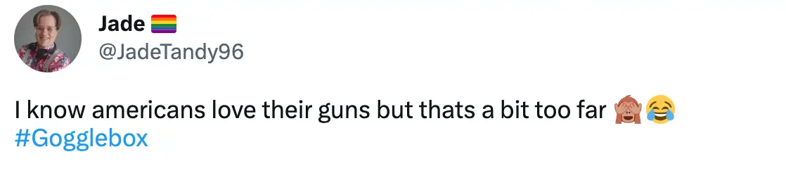 "Something I never thought iI'd see. Someone getting off to a gun," tweeted one viewer.