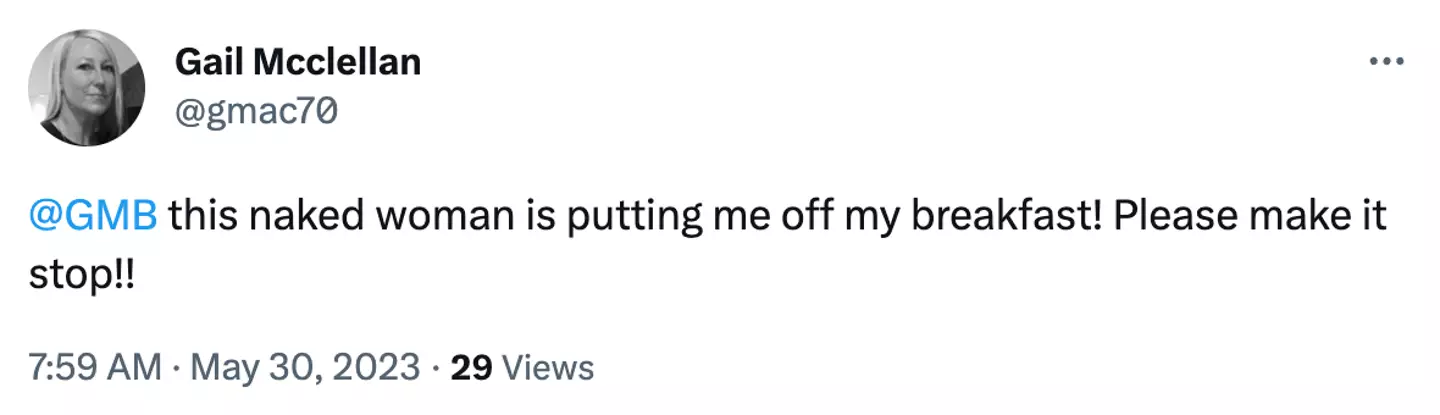 A third added: “@GMB this naked woman is putting me off my breakfast! Please make it stop!!”