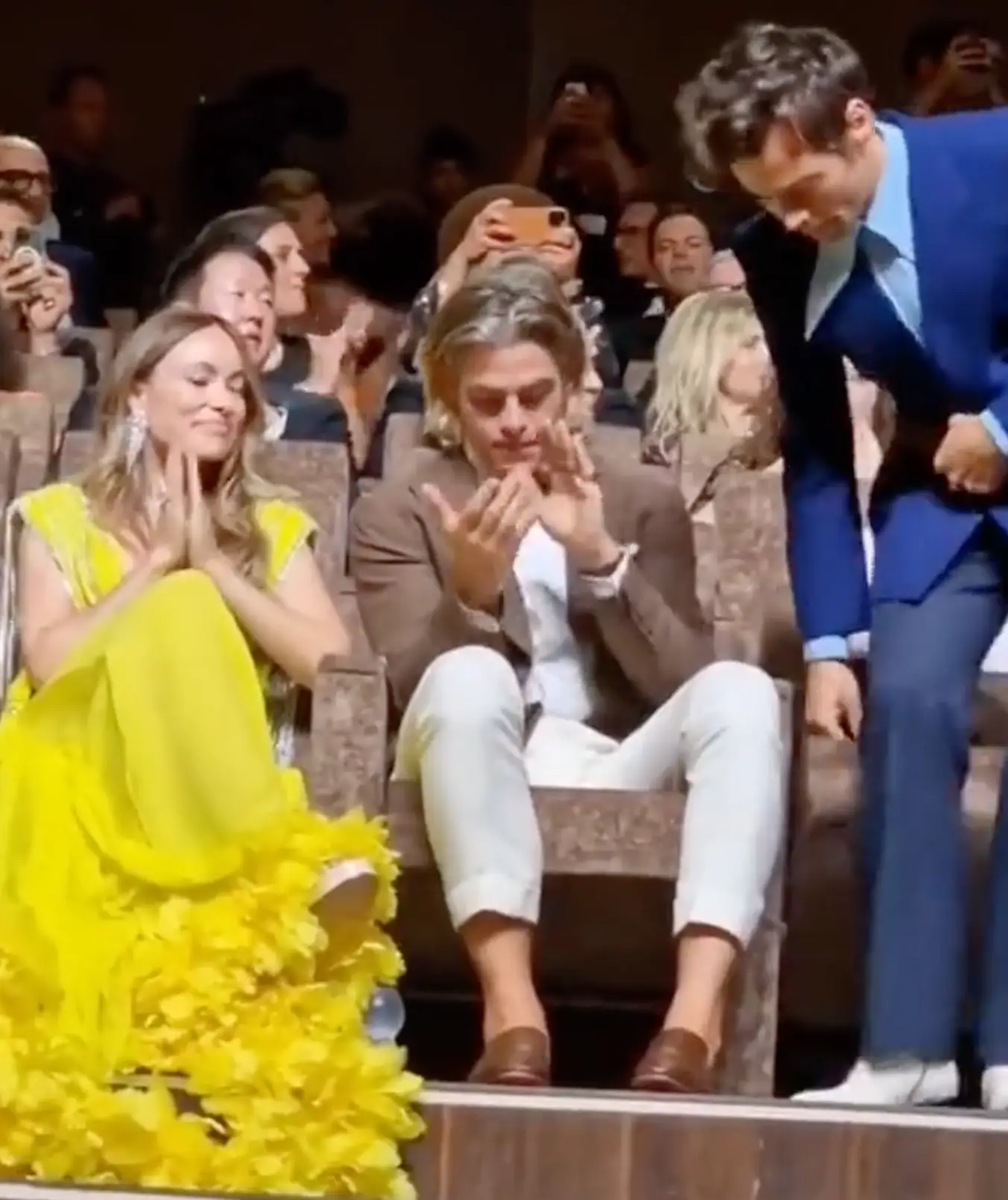 During the event, Pine, who was also sitting next to Styles' girlfriend Olivia Wilde, can be seen looking down at his lap just after he stops clapping.