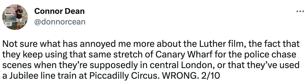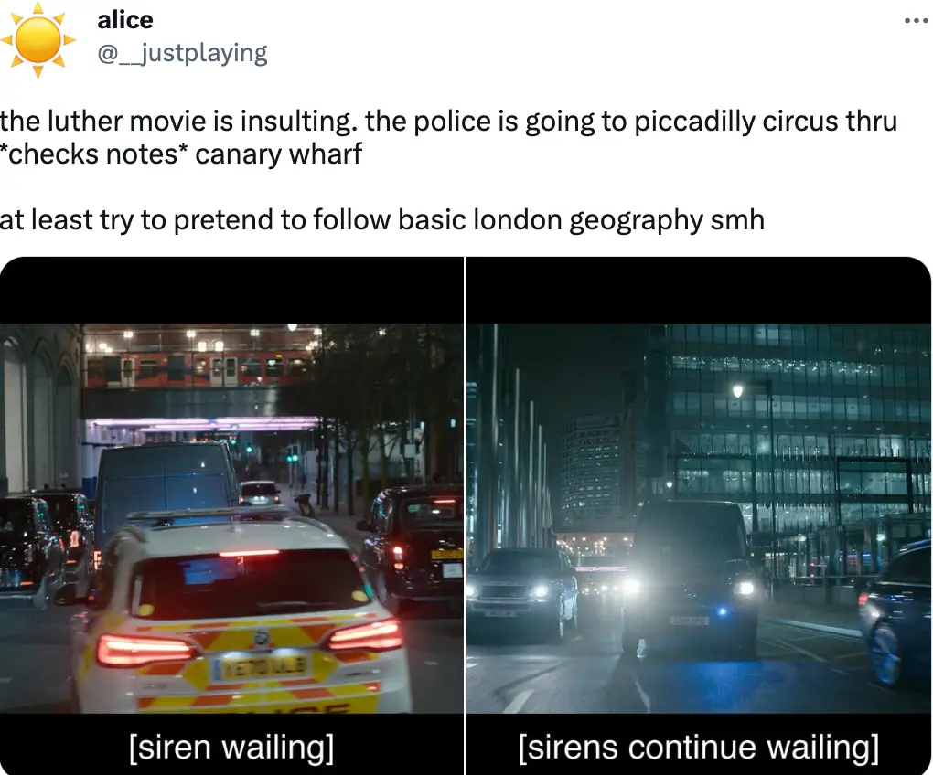 A third person went as far as calling the use of London’s locations ‘insulting’, and shared pictures of a car chase through the streets of Canary Wharf and Piccadilly Circus. The viewer wrote: “The Luther movie is insulting. The police is going to piccadilly circus thru *checks notes* Canary Wharf at least try to pretend to follow basic London geography smh."