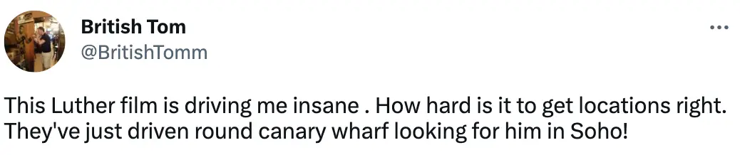 Another fan complained about the film on Twitter, tweeting: “This Luther film is driving me insane. How hard is it to get locations right. They've just driven round Canary Wharf looking for him in Soho!”