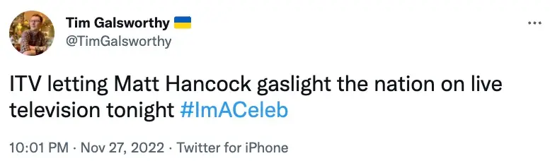 Another said: "ITV letting Matt Hancock gaslight the nation on live television tonight."