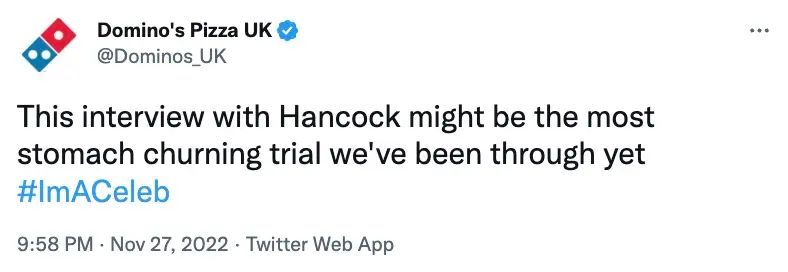 Even Domino's Pizza chimed in, writing: "This interview with Hancock might be the most stomach churning trial we've been through yet #ImACeleb."
