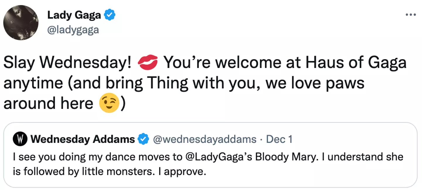 A tweet shared from the official Wednesday Addams Twitter account read: “I see you doing my dance moves to Lady Gaga’s ‘Bloody Mary’. I understand she is followed by little monsters. I approve.”