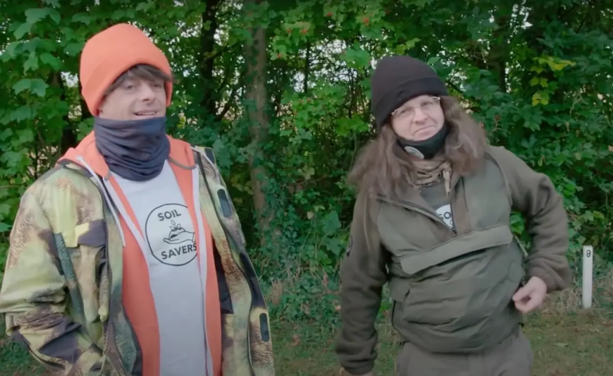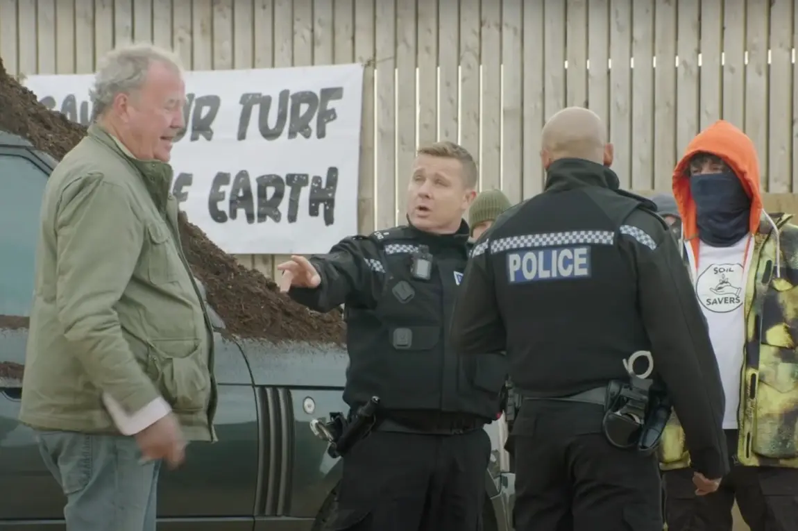 The pair got themselves dressed up as eco-warriors who were picketing outside the farm over the 61-year-old's treatment of his soil, holding signs with messages saying 'Soil has feelings, Clarkson doesn't' written on them.
