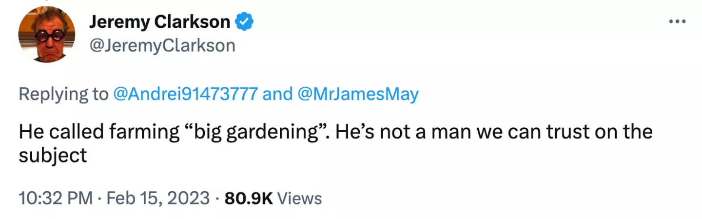 When someone told Clarkson he wasn’t being ‘very nice’, he replied: “He called farming ‘big gardening’. He’s not a man we can trust on the subject.”