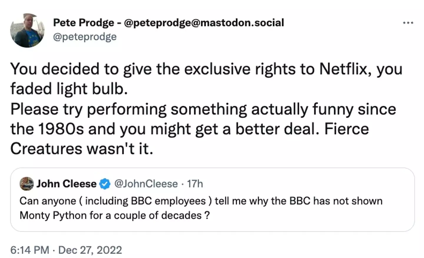 He wrote: "Can anyone (including BBC employees) tell me why the BBC has not shown Monty Python for a couple of decades?"