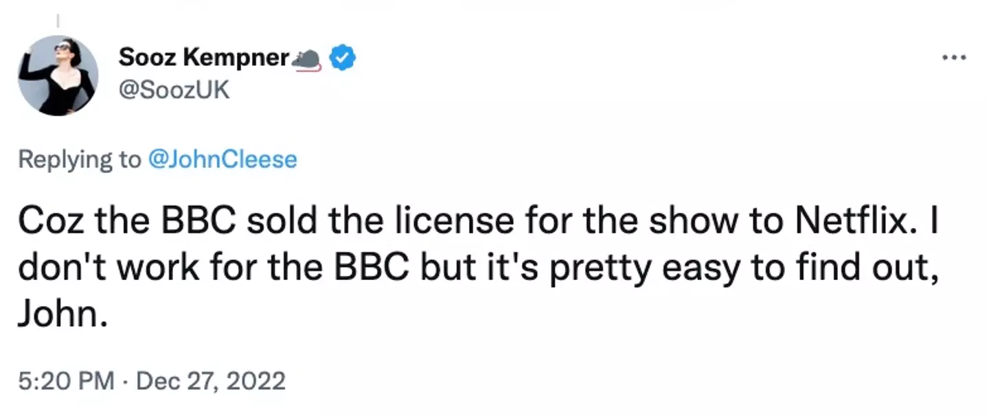 But there's one main problem with Cleese's tweet - he appears to have forgotten the fact that the licensing rights to the show and its property were sold to Netflix several years back.