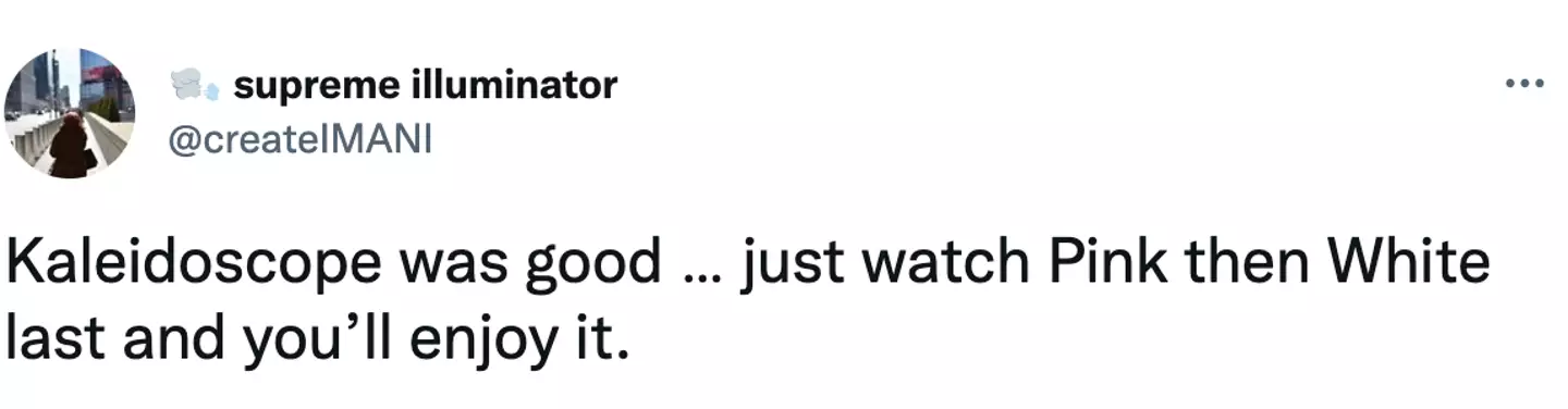 And someone else shared their way to truly 'enjoy' the series, saying: "Kaleidoscope was good … just watch Pink then White last and you’ll enjoy it."