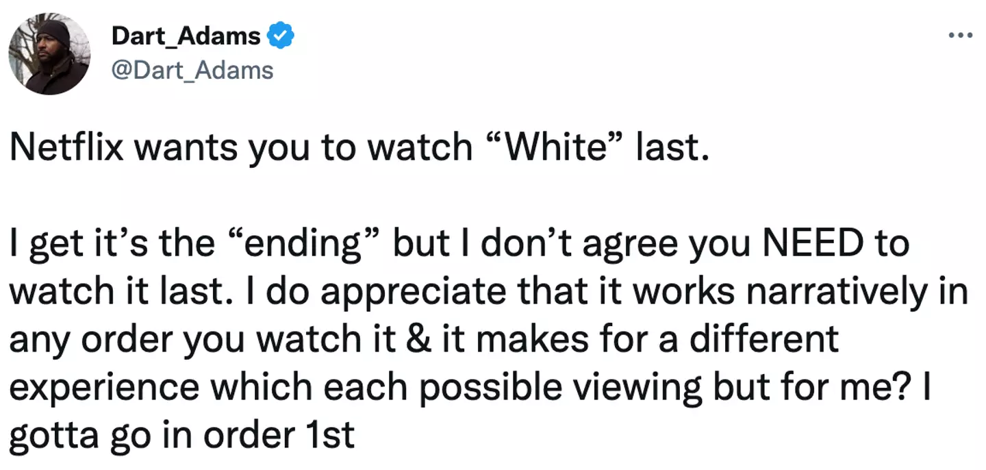 "Netflix wants you to watch White' last," they said. "I get it’s the “ending” but I don’t agree you NEED to watch it last. I do appreciate that it works narratively in any order you watch it & it makes for a different experience which each possible viewing but for me? I gotta go in order 1st."