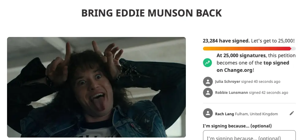 More than 23,000 fans have signed a Change.org petition to bring back Stranger Things 4 breakout character Eddie Munson.